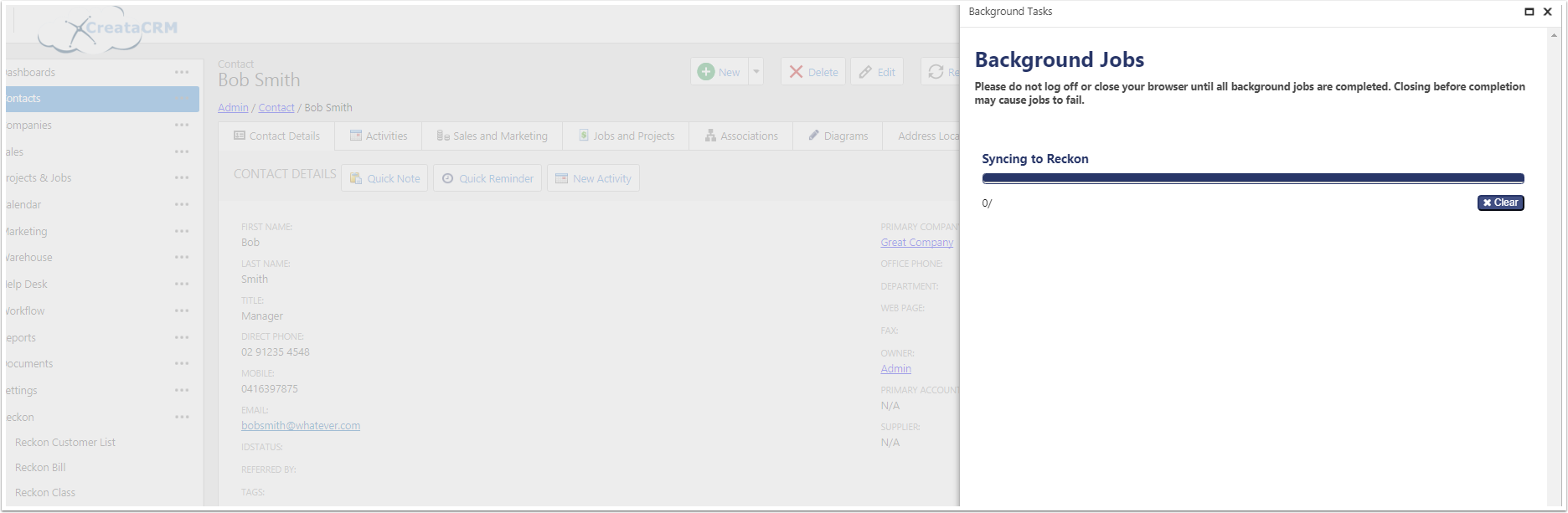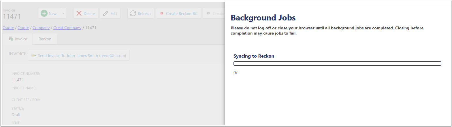 When the invoice is pushed to Reckon, it will grey out the Create Reckon Invoice button, and show the background tasks window.