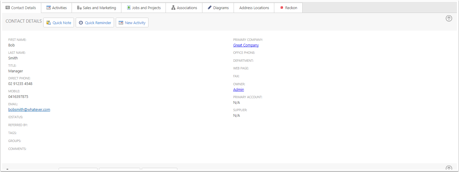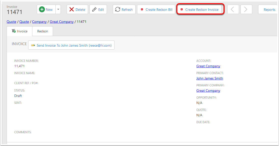 If the Primary Contact, Primary Company or Account is not in Reckon, the Invoice can still be pushed to Reckon - the sync will automatically add the Customer to Reckon before syncing the Invoice. The customer that is added to Reckon is taken from the first of the following that is not blank: