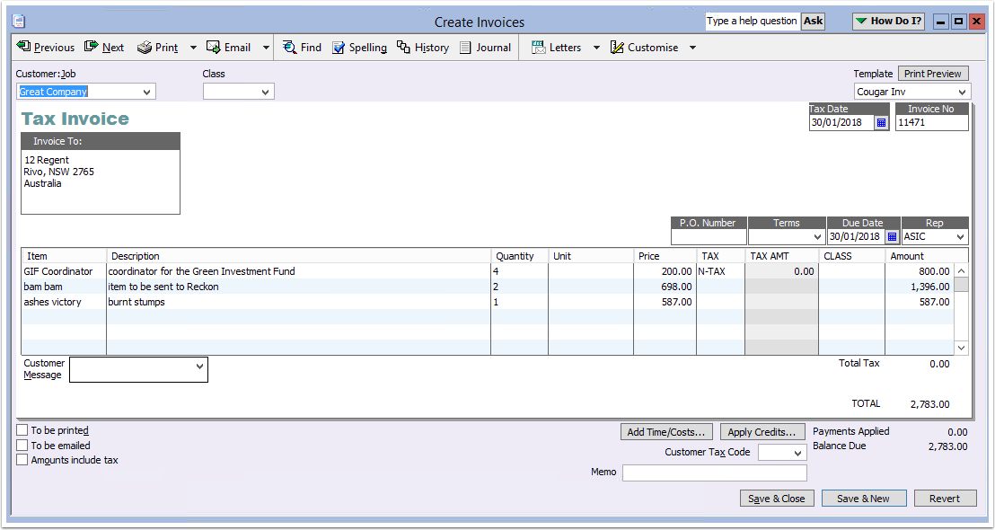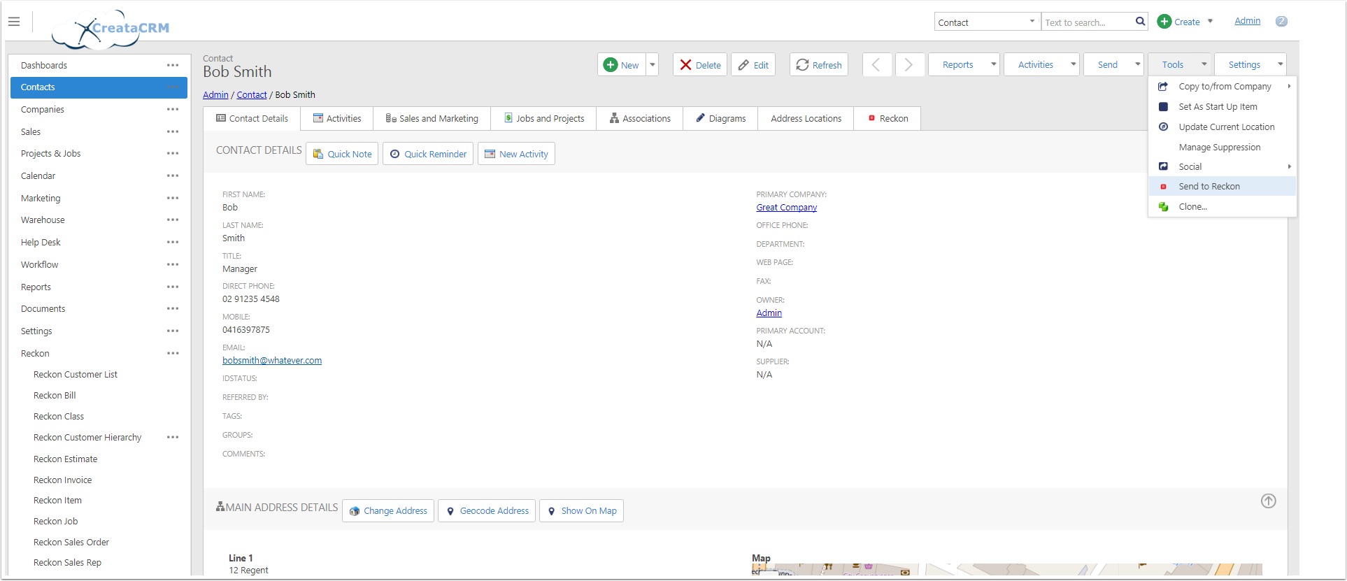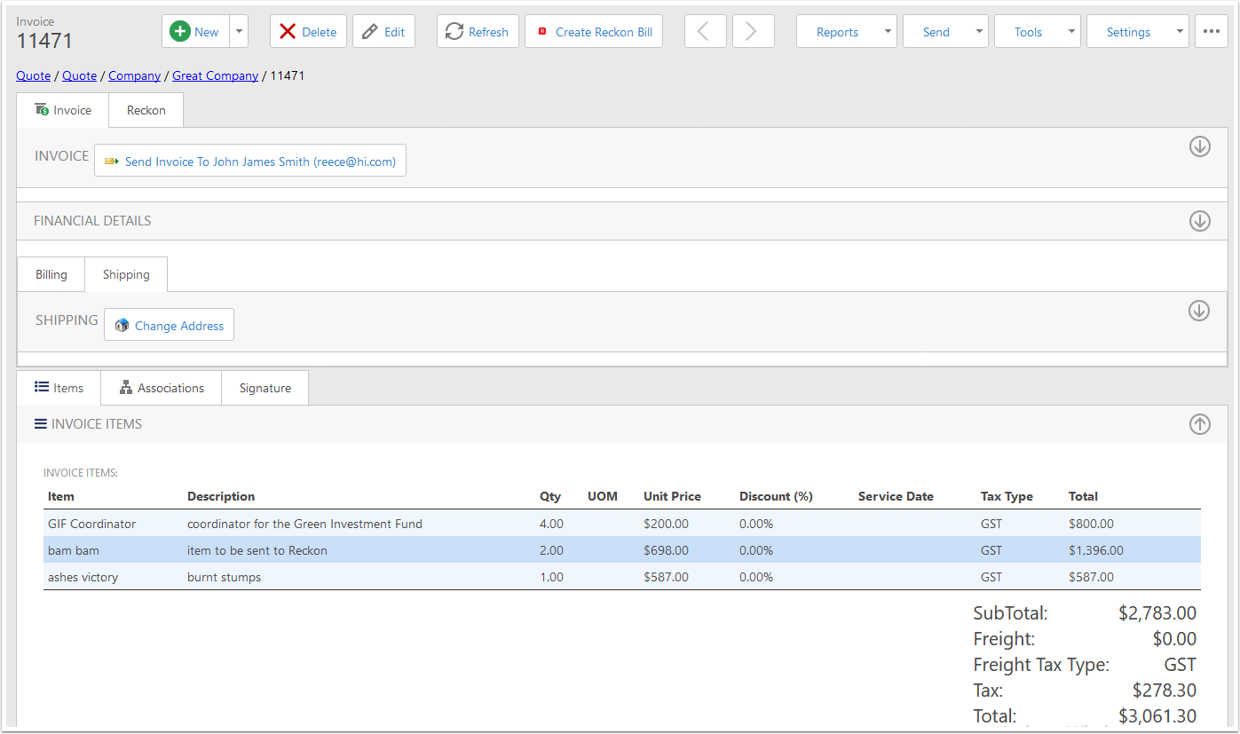 You will also need to make sure that all of the Items on the Invoice are items from Reckon; if one of them is not from Reckon, you won't be able to push the invoice to Reckon. CreataCRM does not currently support adding Items to Reckon, so this will have to be done in Reckon and then synced to CreataCRM.